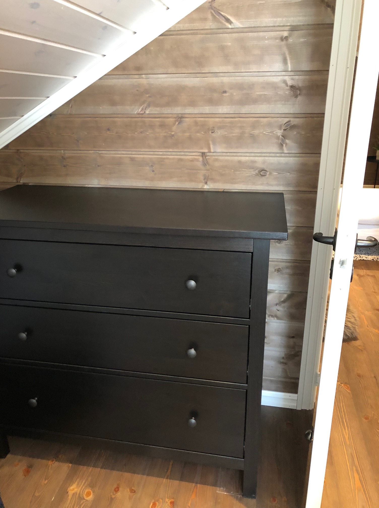 Første soverom oppe på loftet har også fått lamper og liftgardin. Siden taket skrår såpass mye, så valgte vi å feste liftgardinen i selve vinduslisten.