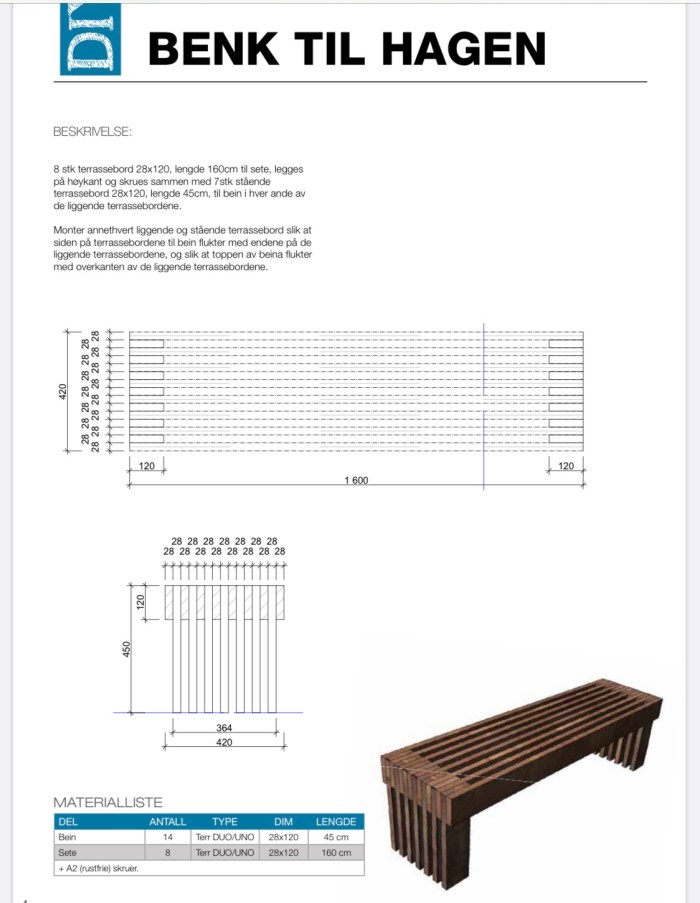 Jeg kom over en DIY PDF brosjyre fra Talgø og der fant jeg mange overkommelige prosjekter hvor vi kunne bruke terrassebord. Sjekk ut https://hoved.talgo.no/app/uploads/2020/03/Idehefte.pdf
