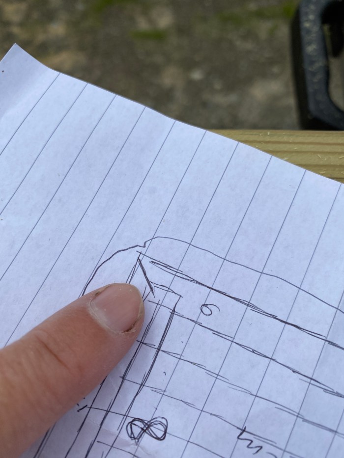 Jeg fortsetter med å lage utemøbler av restematerialene etter fjorårets terrassebygging. Denne gangen tegnet jeg bordplaten. Jeg visste at jeg ønsket 2m lengde og ønsket ca 120cm bredde. Dette skal være et bord hvor vi kan samles rundt, enten for en tacomiddag eller spill & snacks.