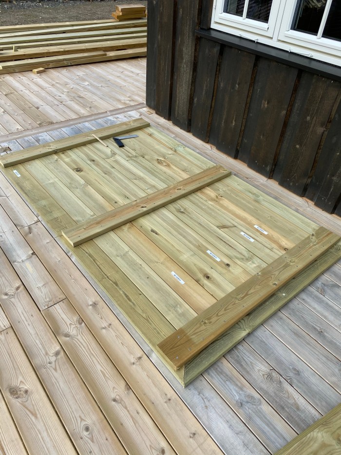 Du legger så bordene slik du ønsker de og kutter opp bord som er litt kortere enn bredden på bordet. Disse skal du skru i bordplatedelene. Se bilde.