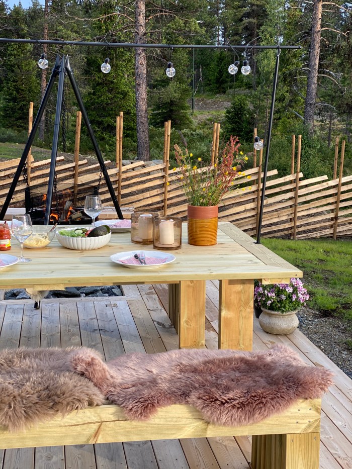 Bena lagde jeg også av restematerialer fra terrassen. Her brukte jeg 2tom6 (48x148mm). Lengden på bena ble 72cm. Her er det litt individuelt hvilken høyde du ønsker.