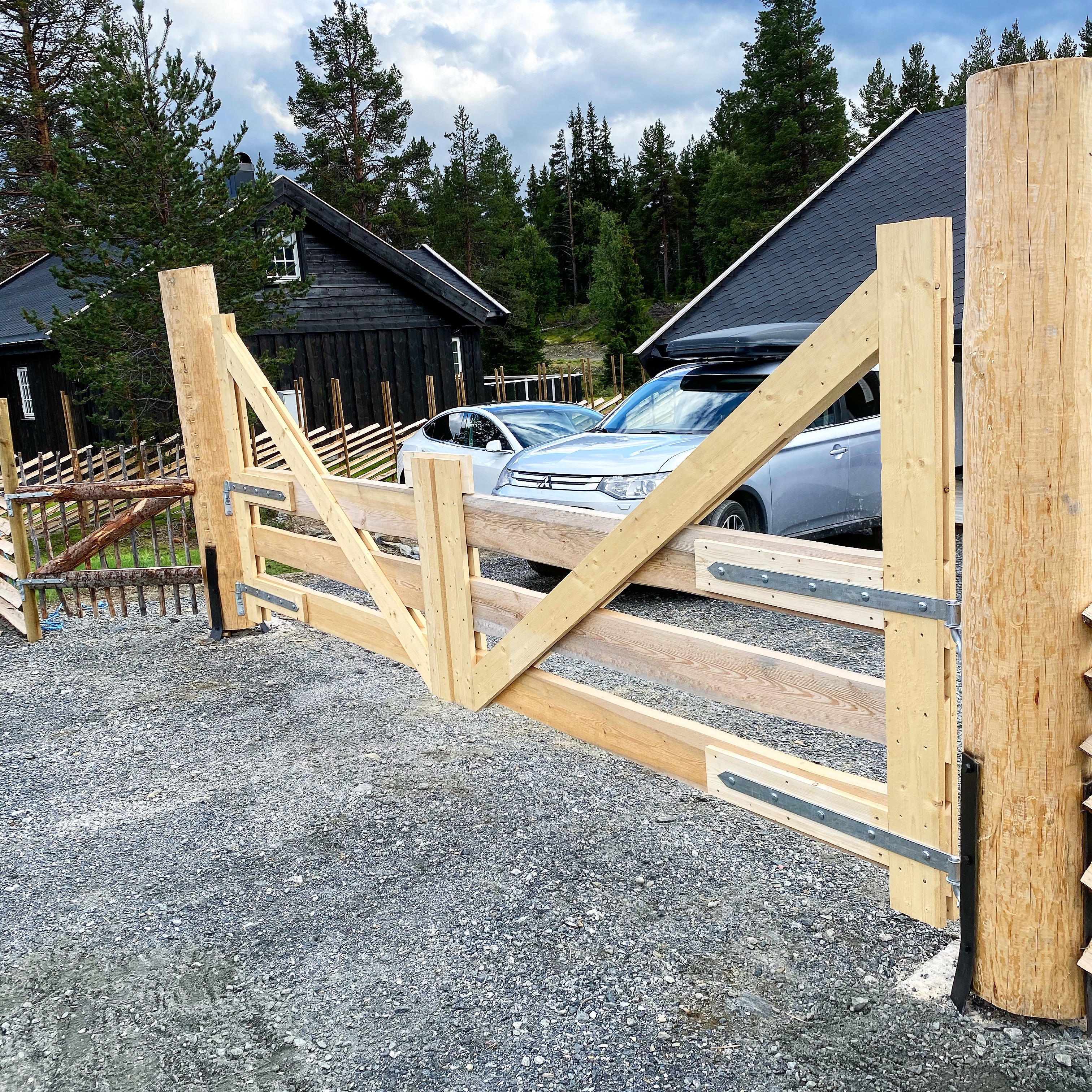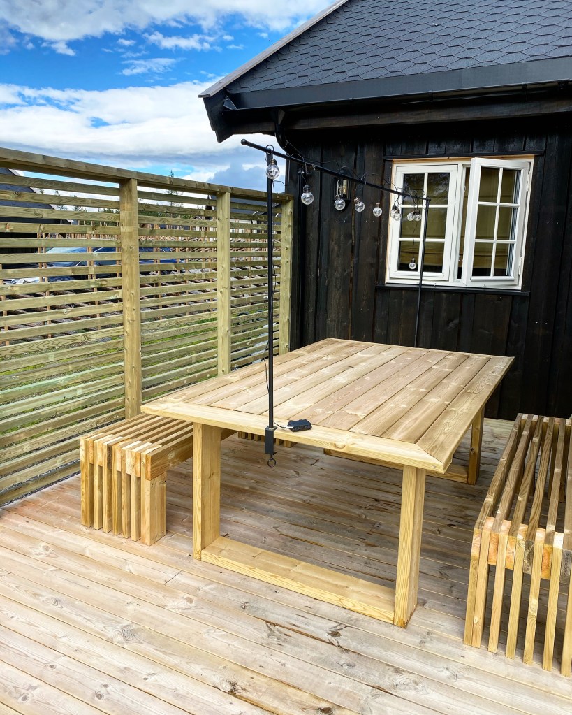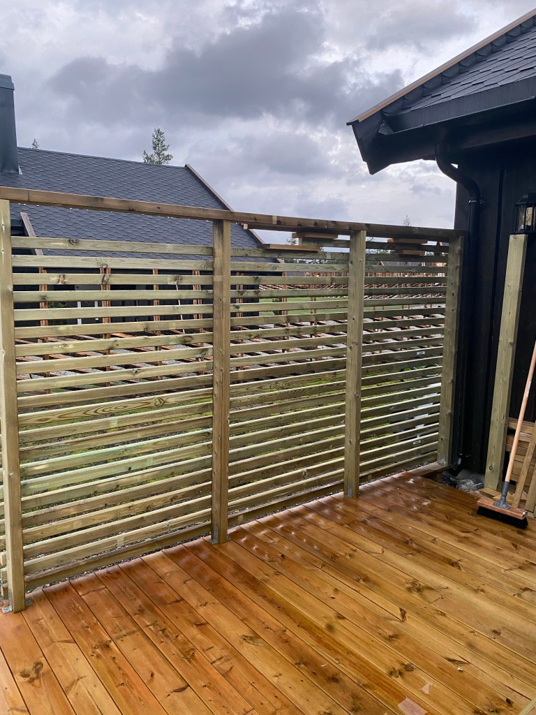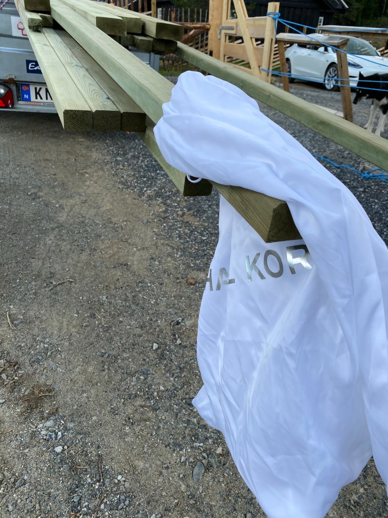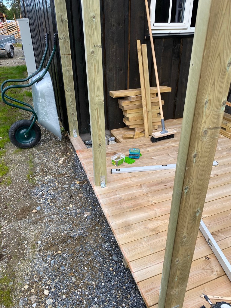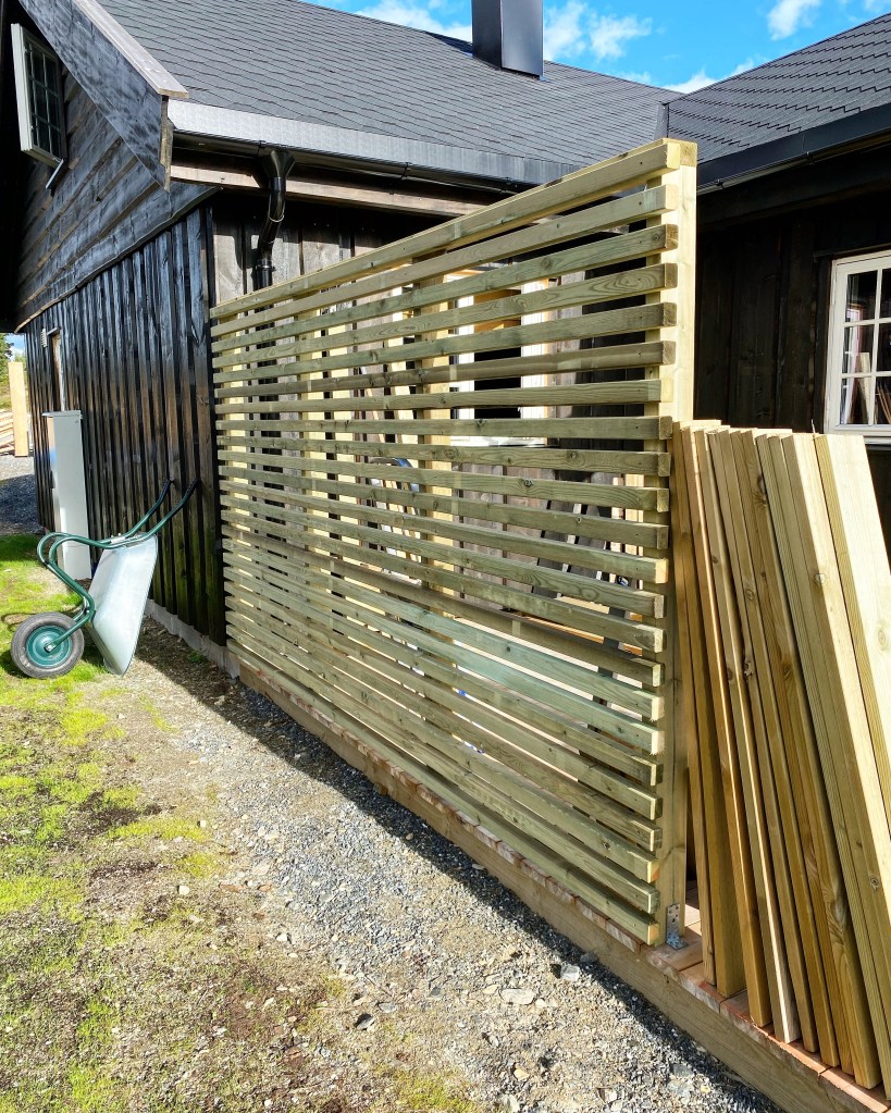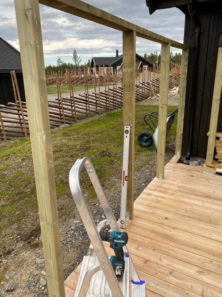 Det var ganske enkelt å finne eksempler på nett, der man kunne se tegninger og dimensjoner på materiale. Kjørte ned fra fjellet og fikk veldig god hjelp på trevare på Byggmakker. Kan ikke si helt det samme inne i butikken… Mannen, som for øvrig lignet på Atle Antonsen i Nav serien, spurte meg flere ganger om jeg skulle bygge leveggen SELV. Helt utrolig! Men heldigvis har jeg bodd så lenge på Østlandet at jeg har «klart» å beherske mitt nordnorske temperament 😂😂 Etter mye om og men fra den ansatte (skulle tro at han fikk bonus på salg)…så fikk jeg stroppet ferdig og satt turen opp på fjellet igjen.