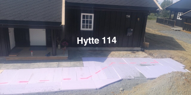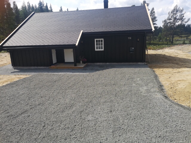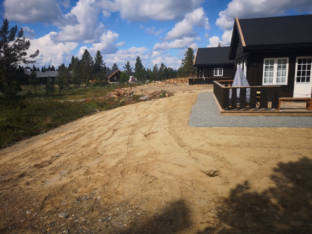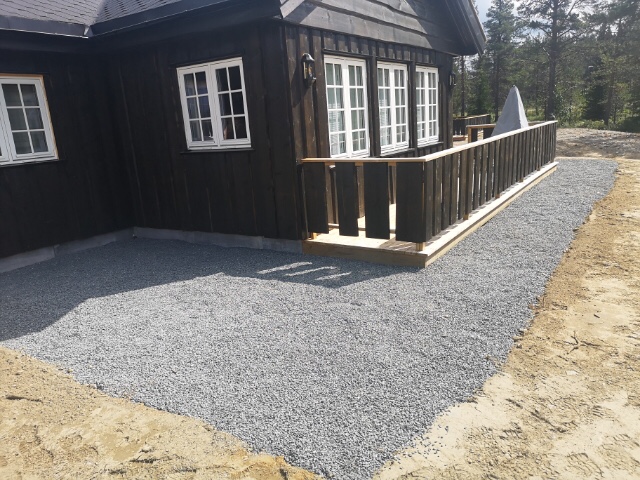 Fagernes Anlegg hadde oppdraget. De har gravd, lagt ned isolasjon, lagt på grus og jord. Terrassen vil legges der vi har grus. Vi legger da terrassen «flytende» på grusen, kun festet i eksisterende terrasse og platting ved inngang. Isolasjon er også lagt ca 1m utenfor der terrassen skal ligge. Dette er gjort for å forhindre store bevegelser som kan påvirke terrassen. Ny læring for oss som er vant til andre metoder i lavlandet🎶